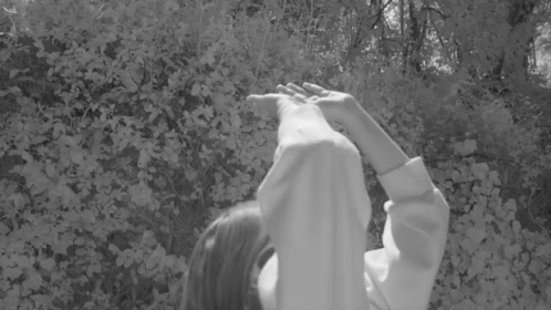Rigoberta Bandini shields her eyes from the bright sun, looking upwards with hands raised in a black and white scene.