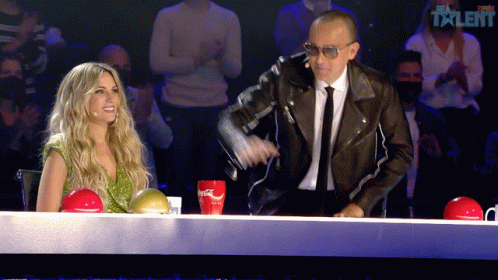 Risto Mejide waves and smiles at the judges' table on Got Talent España, next to a blonde female judge.
