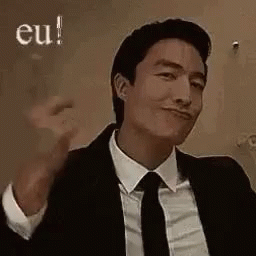 A man in a suit and tie smirks mischievously and points to himself, with the word 'eu!' visible.