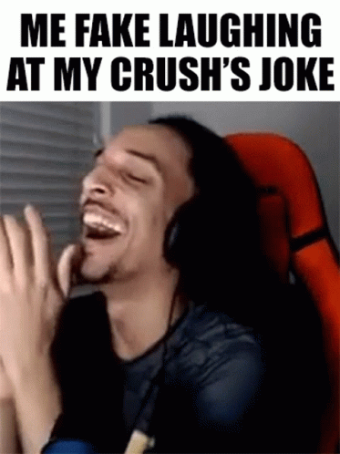 A man wearing headphones fake laughs at his crush's joke, a relatable meme moment.