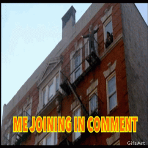 A meme from Coming to America showing a character on a fire escape and another in a window, with text about joining comments and a negative response.
