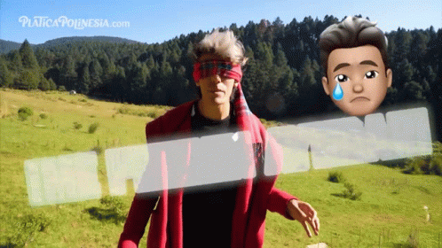 A blindfolded person, possibly from Los Polinesios, asks for help in a challenge, seeking guidance.