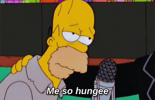 Homer Simpson, looking sad and hungry, speaks into a microphone with the text 'Me so hungee' displayed.