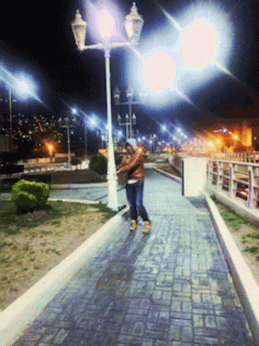 A person in a hooded jacket walks on a brick pathway at night, illuminated by bright streetlights.