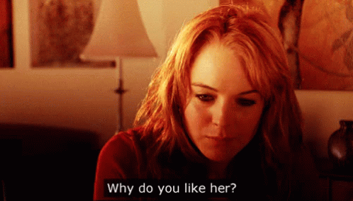 Lindsay Lohan as Cady Heron in Mean Girls asks 'Why do you like her?' in an iconic movie scene.
