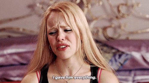 Regina George (Rachel McAdams) from Mean Girls cries, saying 'I gave him everything,' expressing deep heartbreak.