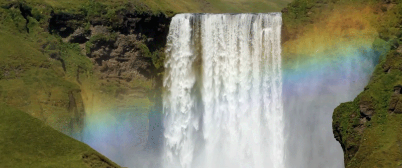 A majestic waterfall in Iceland with a vibrant rainbow arching through its mist.