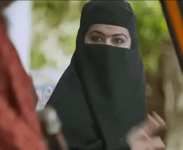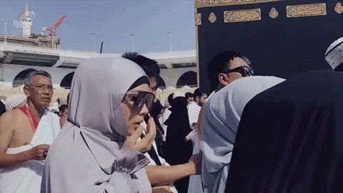 Syahrini performing Umrah pilgrimage in Mecca, wearing a grey hijab and sunglasses near the Kaaba.