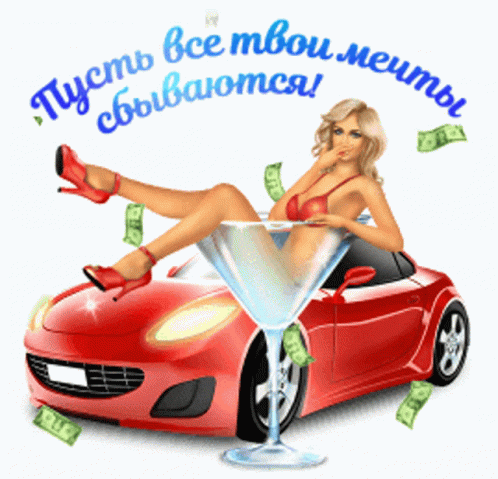 A glamorous blonde woman in a red bikini and heels sits in a giant martini glass with a red sports car and falling money.