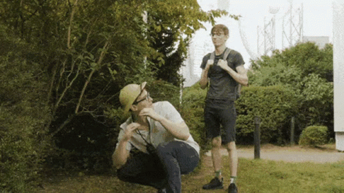 A man in a safari hat squats and searches in a bush, while another man with a backpack stands nearby.