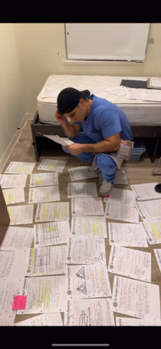 A medical student, Andreas Poly, intensely cramming for finals, surrounded by study notes from St. George's University.