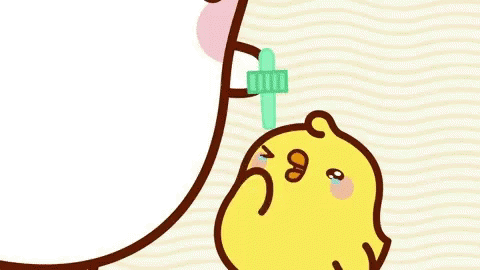 Molang gives Piu Piu eye medicine with a dropper, comforting the little chick.