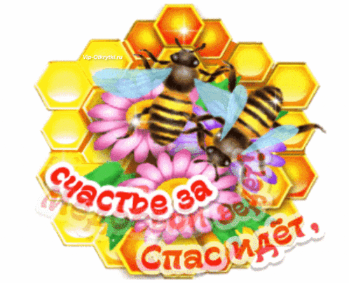 A vibrant image featuring bees, honeycomb, and colorful flowers, with Russian text about 'Honey Spas' and happiness.