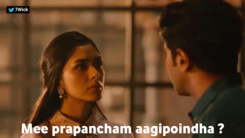 Dulquer Salmaan and Mrunal Thakur in a poignant scene from Sita Ramam, with the caption 'Has your world stopped?'