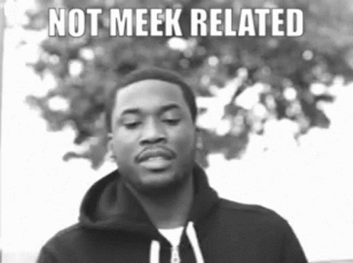 Rapper Meek Mill in a black and white meme with the text 'NOT MEEK RELATED' above him.