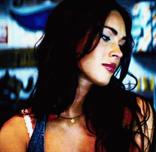 Megan Fox with long dark hair, wearing a necklace and a denim top, looks towards the camera.