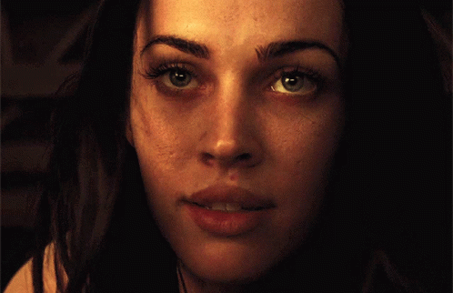 Close-up of Megan Fox with an intense expression and glowing, eerie eyes.