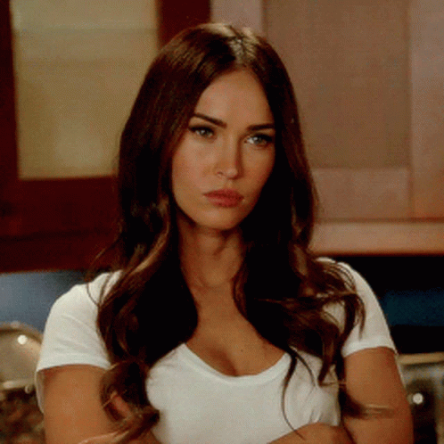 Megan Fox, the actress, poses with her arms crossed, wearing a simple white t-shirt and a serious expression.