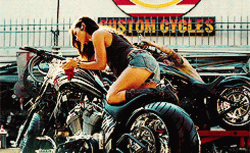Meganfox kneels on a custom motorcycle, wearing denim shorts and a tank top, in front of a 'Custom Cycles' sign.
