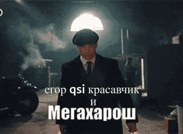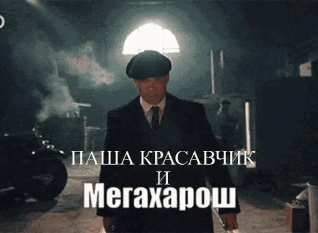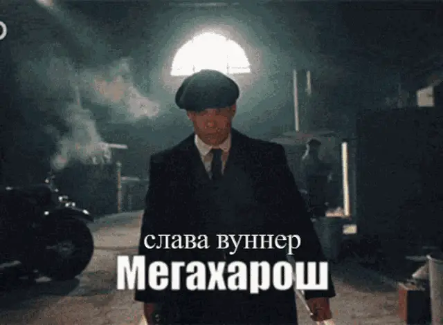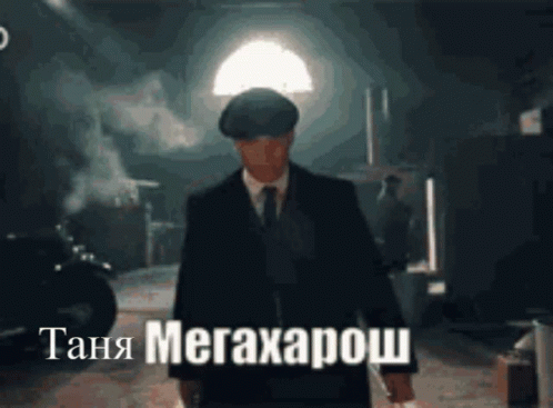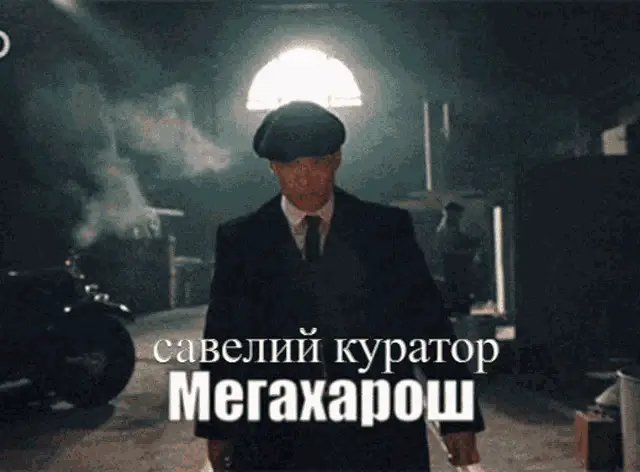 A man in a suit and flat cap walks through a smoky setting, with the caption 'Tanya Megakharosh' displayed.