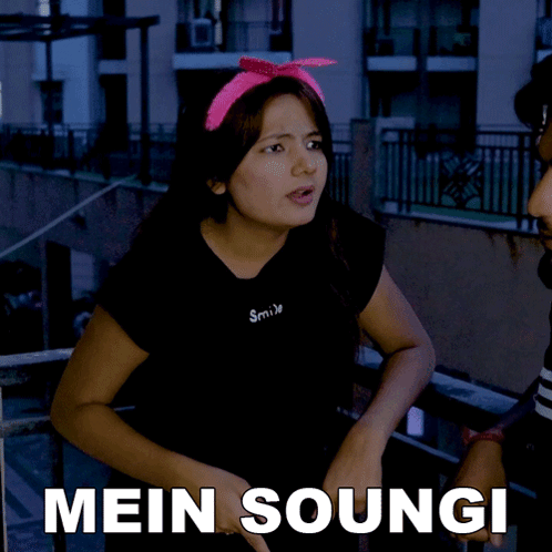 Yogita Bachani, wearing a pink headband, says 'Mein Soungi' (I will sleep) on a rooftop.