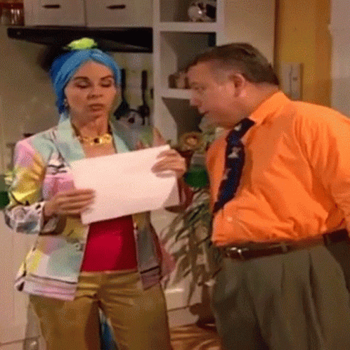 Doña Magda (Macaria) tells someone to shut up, holding a paper in a scene from Vecinos.