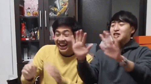 Jerome Polin and Yusuke enthusiastically wave their hands and laugh while sitting at a table.