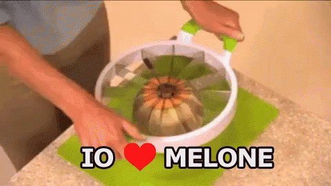 A person uses a melon slicer to cut a melon, with the caption 'I love melon' displayed, as children watch in surprise.