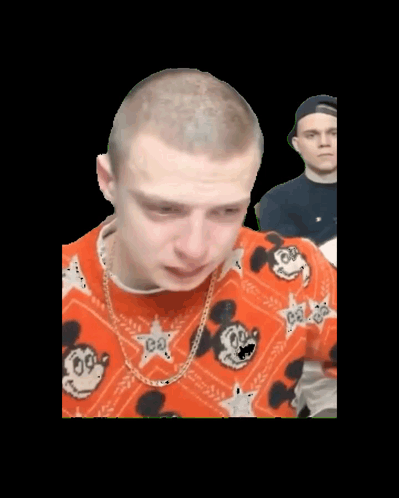 Мелстрой, wearing a Mickey Mouse sweater and gold chain, appears emotional and wipes his eyes.