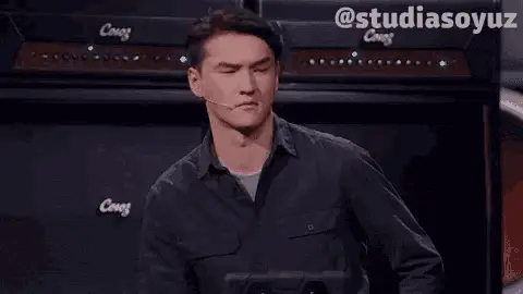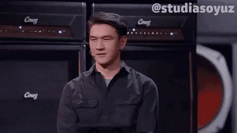 Мелстрой reacts with wide eyes and an open mouth, holding onto a chair in a living room.