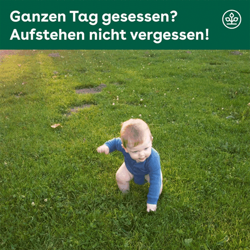 A baby learning to stand and walk in the grass, with a German health reminder to stand up after sitting all day.