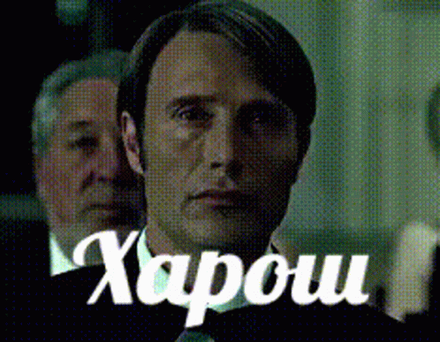 Mads Mikkelsen featured in a memeblog clip with the Russian word 'Kharosh' (Good) overlaid on his image.