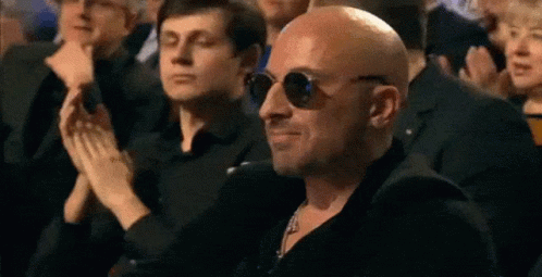 Dmitry Nagiev, a bald man in sunglasses, smiles and subtly reacts while sitting in a crowd of applauding people.