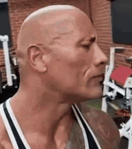 Dwayne "The Rock" Johnson turns his head with a skeptical and questioning expression in a gym setting.