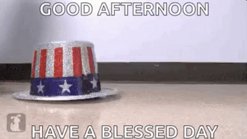 A tiny kitten pops out from under a patriotic Memorial Day hat, wishing a blessed afternoon.