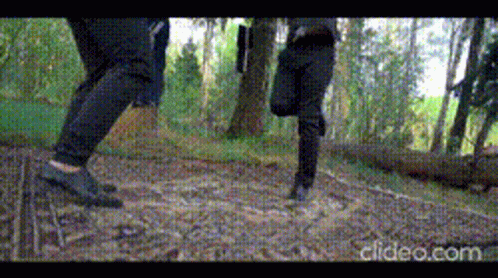 Two men in suits perform synchronized dance moves and stunts in a forest setting.