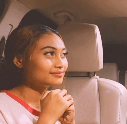 Novia nods agreeably while sitting in the back seat of a car, smiling softly.