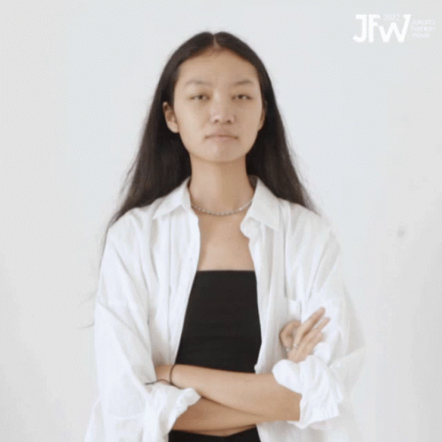 Model at Jakarta Fashion Week shaking her head, wearing a white shirt and black tube top.