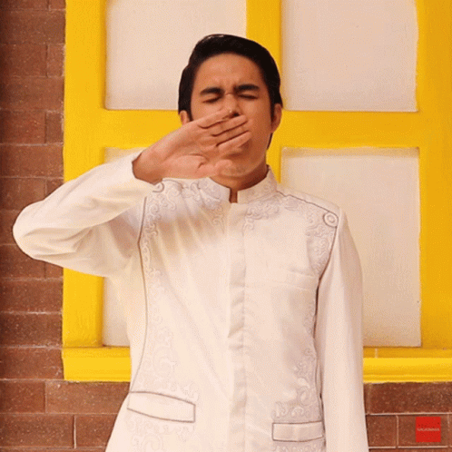 Ilham yawns, covering his mouth, looking tired in a white embroidered shirt.