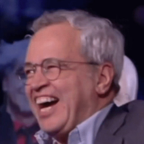 Mentana laughing heartily while seated in a crowd, wearing glasses and a suit.