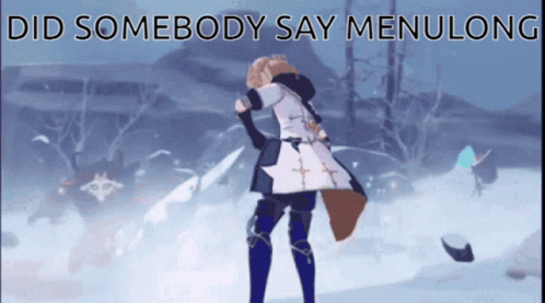 Albedo from Genshin Impact summons Klee with the meme text 'Did somebody say Menulong' appearing on screen.