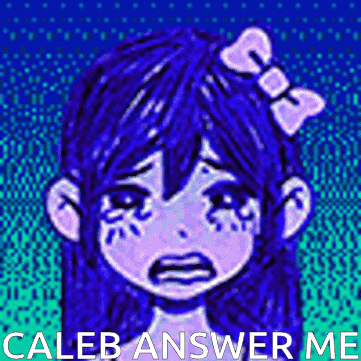 A pixelated character with blue hair cries, pleading 'CALEB ANSWER ME'.