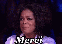 Oprah Winfrey is visibly emotional, shedding tears while expressing gratitude with the French word 'Merci'.