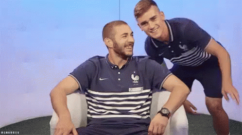 Karim Benzema and Antoine Griezmann pose for a photo, making peace signs and smiling, with 'Merci' text.