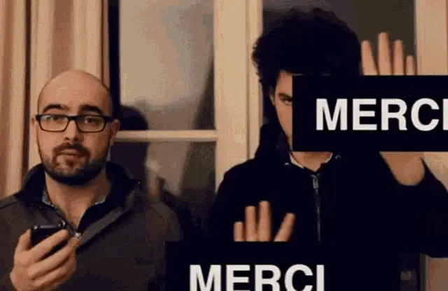 Jacquouille in a brown robe exclaims 'Thank God!' in a medieval camp setting.