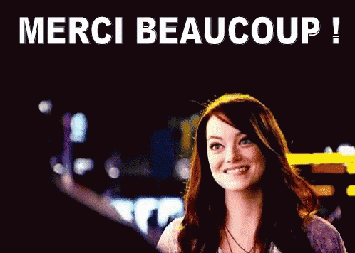 Emma Stone smiles and gives a thumbs up, expressing gratitude with 'Merci Beaucoup'.