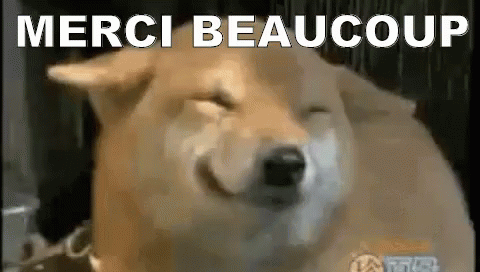 A happy Shiba Inu dog smiles with closed eyes, with the French text 'Merci Beaucoup' displayed above it.