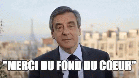 François Fillon expresses gratitude, saying 'Merci du fond du coeur' against a city skyline backdrop.