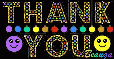 A vibrant and glittery animated 'Thank You' message with colorful letters, smiley faces, and 'Beauga' signature.