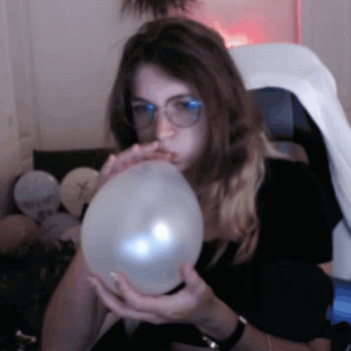 Merizium, a woman wearing glasses, blows up a clear balloon, preparing for a celebration.